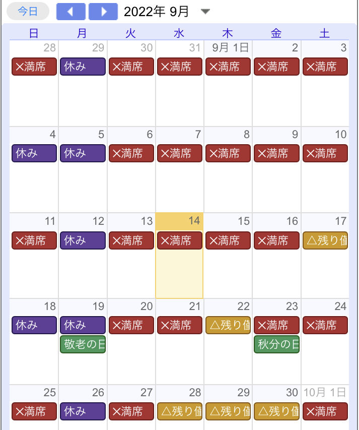 この予約状況は今現在(2022年9月14日)の状況ですので